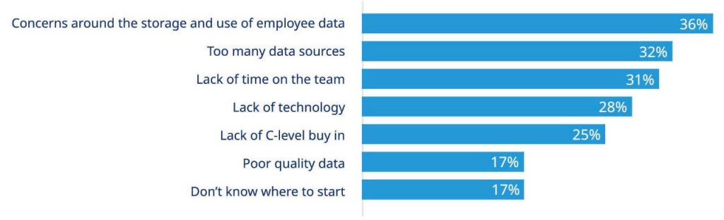 Chart accessible description: Scoring 36%, concern around the storage and use of employee data comes in first place. This is closely followed by employers struggling with too many data sources at 32% and a lack of time on the team to dedicate to analytics with 31%. In fourth and fifth position, with 28% and 25% respectively, is a lack of technology and a lack of C-level buy in. Finally, poor quality data and not knowing where to start are in the joint sixth position at 17%, showing there is still an issue with access to reliable data and guidance on how to analyze it effectively.